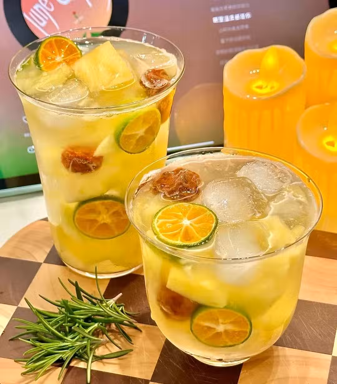 菠蘿:果肉質地細膩,口感爽脆多汁,帶有獨特的酸甜味和濃郁的香氣,話梅的酸甜度適中,口感鮮美多汁,咬一口下去,酸甜汁液在口中四溢,同時含有豐富的維生素和礦物質,在飲品中,話梅能增添一抹獨特的咸酸回甘。小青檸的清香撲鼻,酸爽提神,是夏日飲品的絕佳搭檔。在飲品中加入小青檸,不僅能提升整體的清新感,還能幫助消化、增進食慾。氣泡水能為飲品注入豐富的氣泡刺激感,帶來清爽無負擔的飲用體驗。同時,氣泡水中的CO₂還能促進清涼感。冰塊是夏日飲品的必備元素,它能迅速降低飲品的溫度,帶來冰涼的口感。