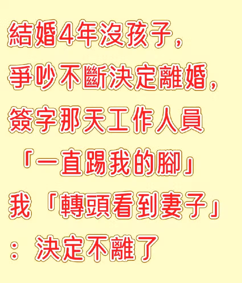 結婚4年沒孩子,爭吵不斷決定離婚,簽字那天「工作人員一直踢我的腳」我「轉頭看到妻子」:決定不離了