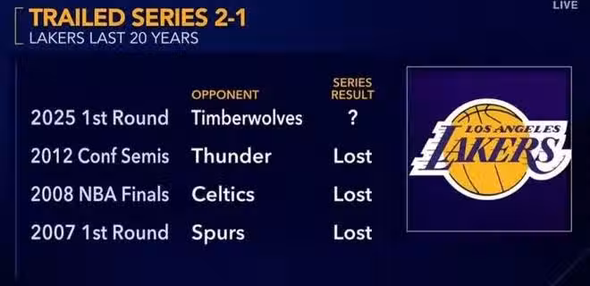 首先第一點,1:2落後的情況下,最近20年里湖人遭遇了三次這樣的情況,結果最終都輸掉了,分別是07年的時候面對太陽,08年的時候面對凱爾特人和12年的時候面對雷霆。因此現在這個比分,對湖人這支球隊是一個幾乎不可能翻盤的比分,這是他們迎來的第1個壞消息,想翻盤不容易。