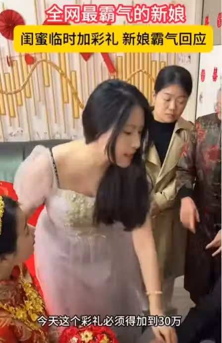 近日,新娘在結婚當天,穿好了禮服開開心心的等著老公來接親,沒想到旁邊閨蜜卻慫恿新娘臨時加彩禮,現在不加彩禮,結婚後你就啥也得不到了。