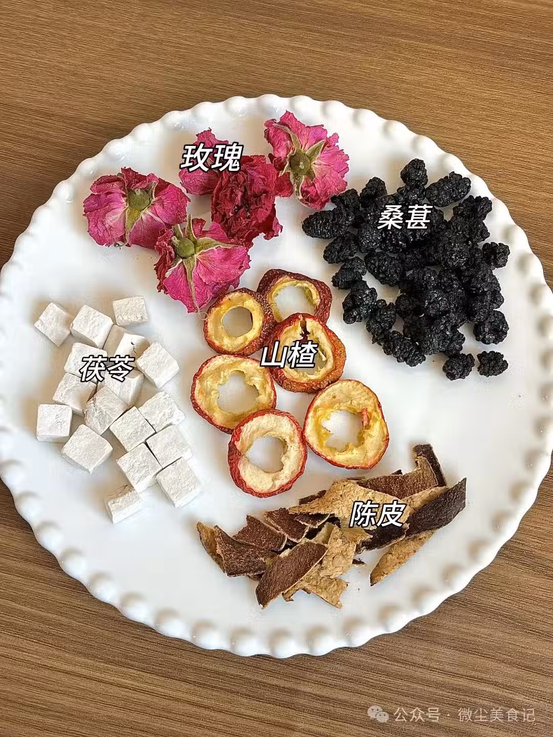準備:桑葚干,玫瑰,茯苓,山楂,陳皮