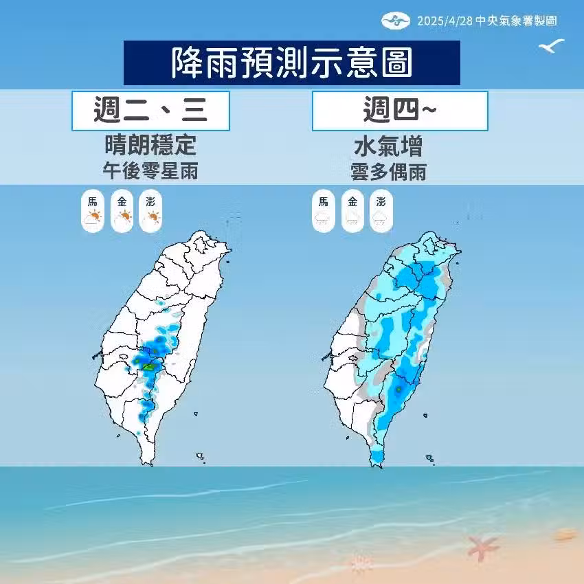 周四到周六天氣將明顯轉變,水汽明顯增多。東半部及恆春半島地區會出現局部短暫陣雨,西半部地區午後也可能出現雷陣雨。值得注意的是,氣象署特別提醒,部分地區會出現平均風力6級以上,或陣風達8級以上的強風。