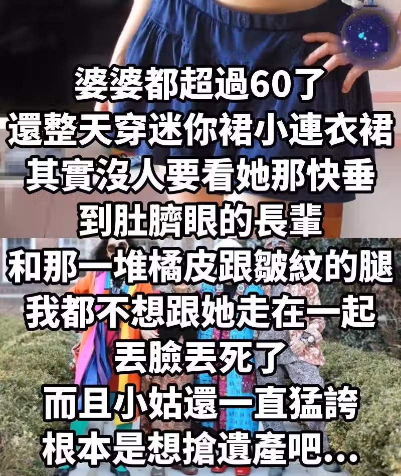 「婆婆都超過60了,還整天穿迷你裙、小連衣裙...其實沒人要看她那快垂到肚臍眼的長輩,和那一堆橘皮跟皺紋的腿!我都不想跟她走在一起,丟臉丟死了,而且小姑還一直猛夸,根本是想搶遺產吧...」 #反被網友罵翻