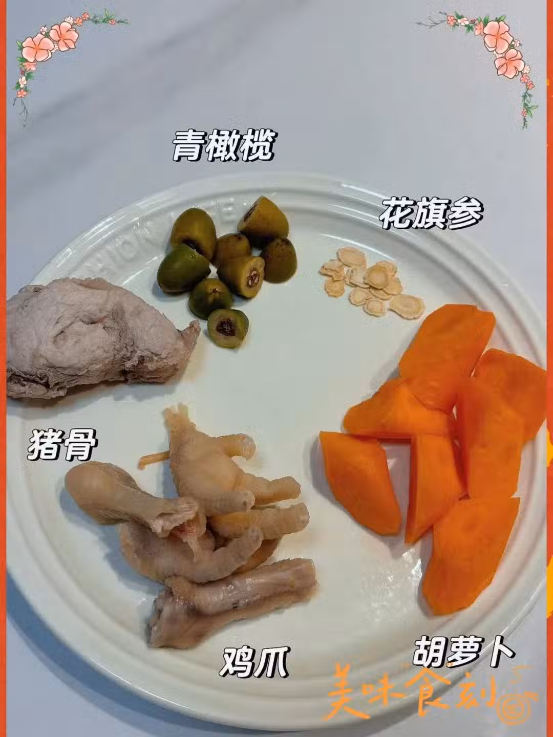 花旗參片10克、青橄欖8顆、豬骨300克、雞爪6隻、胡蘿蔔1根、蜜棗1顆