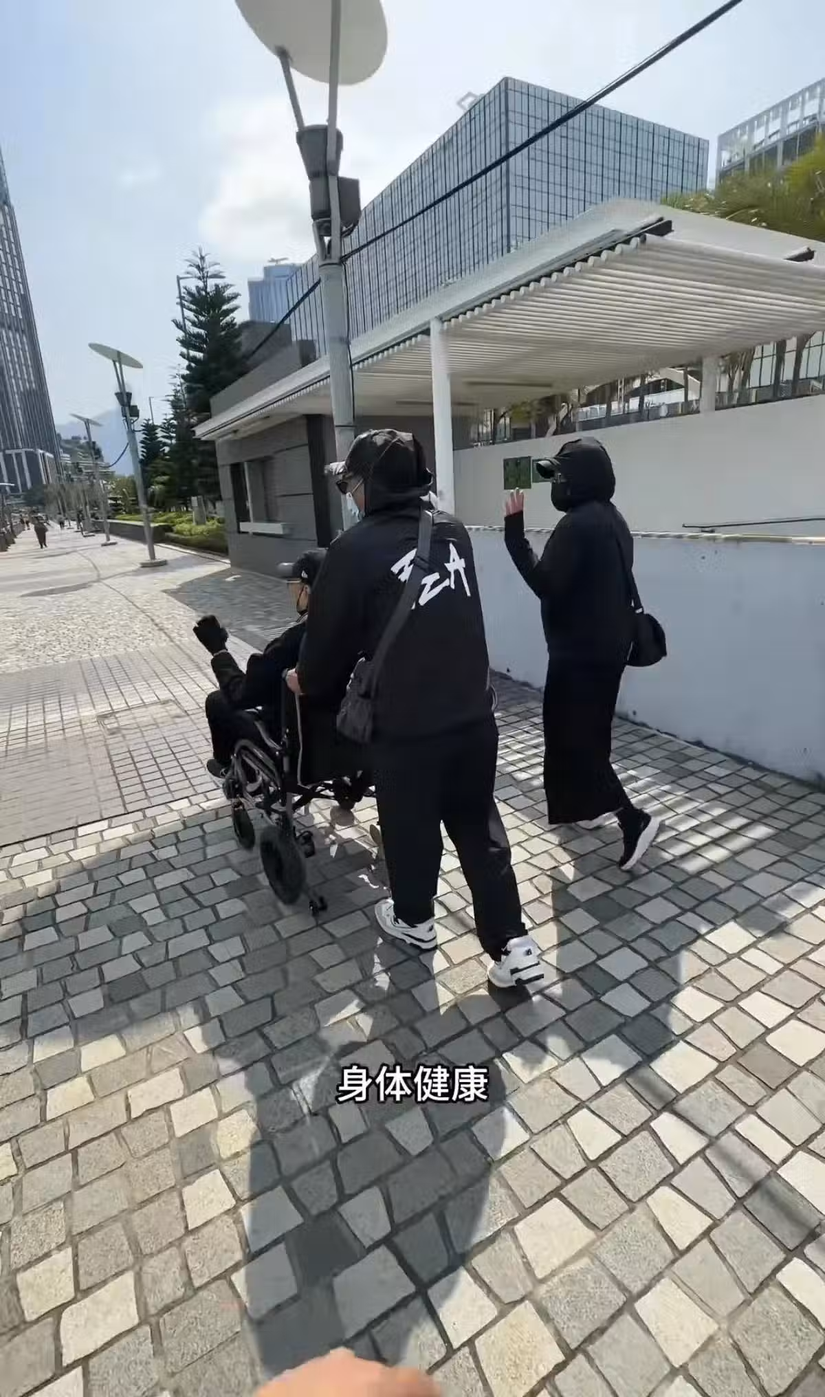 路人祝謝賢身體健康,謝賢微笑了一下,繼續往前走,他的兩個保姆也揮手跟路人告別。