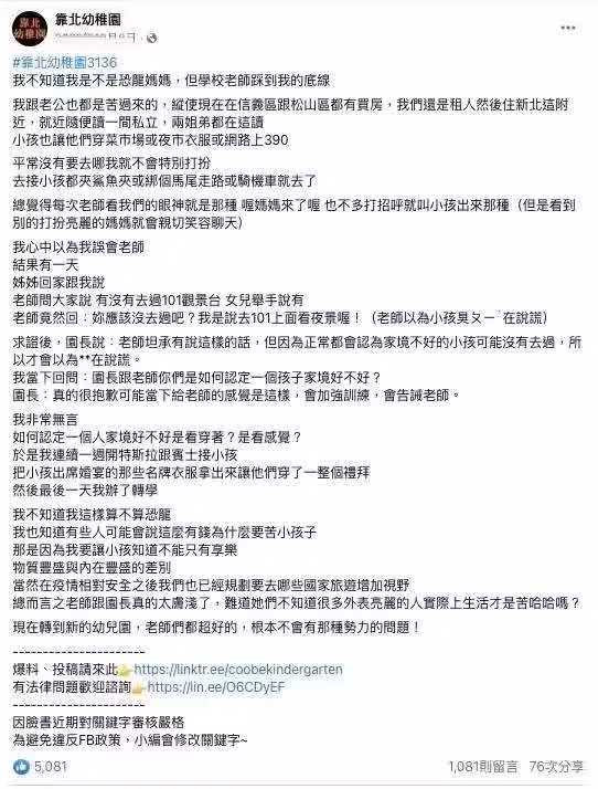 PO文曝光後立刻引來數千名家長盛讚:「老師視野太低了,很多有錢人不開奔馳」、「這種有特異差別眼光的老師才該檢討。