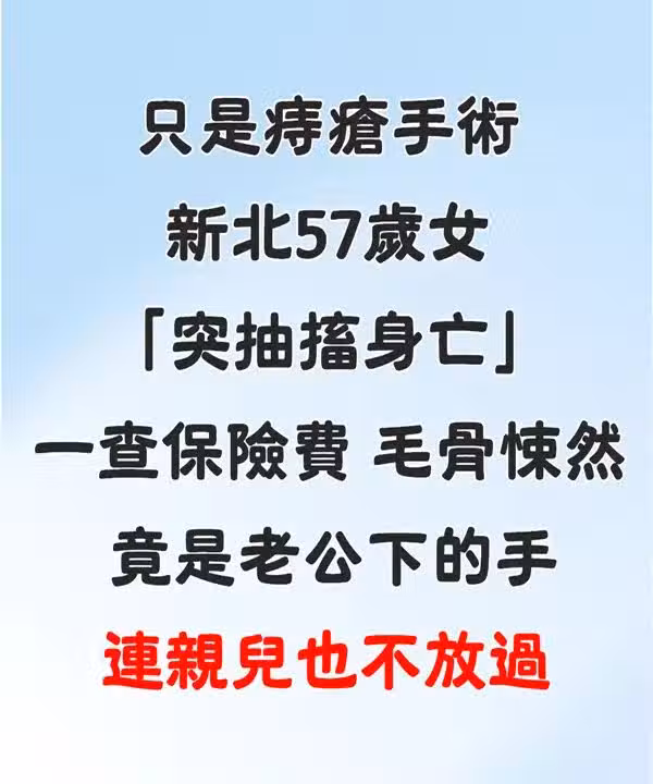 只是痔瘡手術!新北57歲女突抽搐身亡 「一查保險費」毛骨悚然:老公下的手 #連親兒也不放過