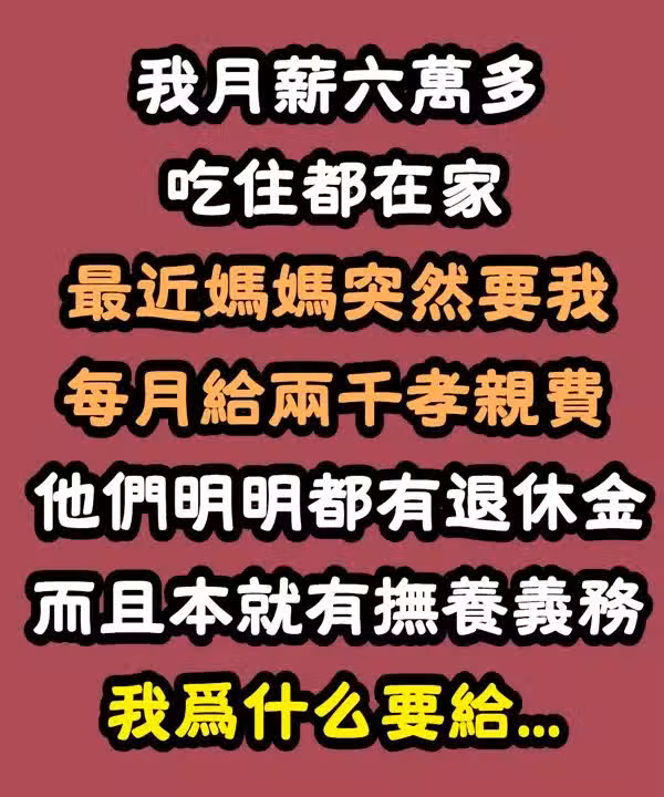 我月薪六萬多,吃住都在家,最近媽媽突然要我「每月給2千孝親費」他們明明都有退休金...而且本來就有撫養義務,我為什麼要給...
