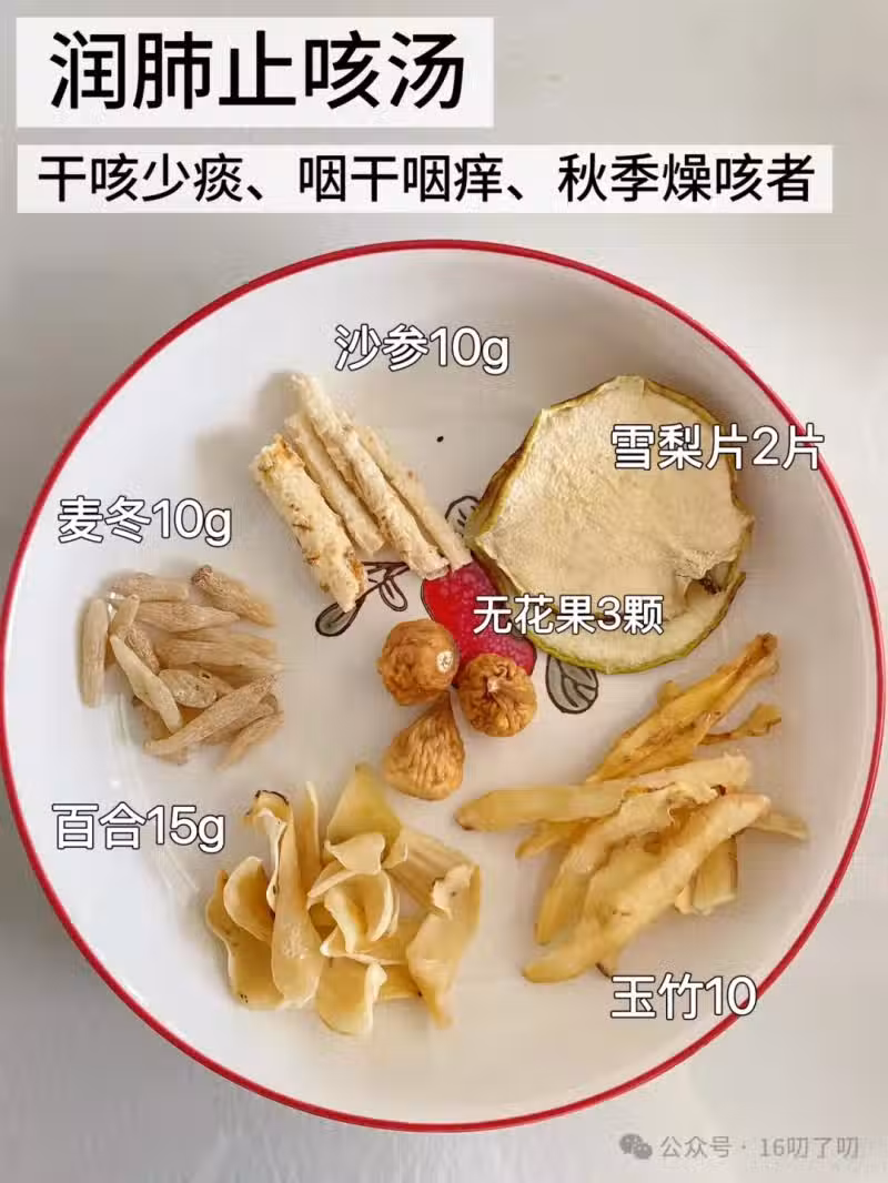 🌟功效:沙參、麥冬養陰清肺,百合潤燥止咳,玉竹生津潤燥,雪梨片清熱化痰,無花果潤喉利咽。