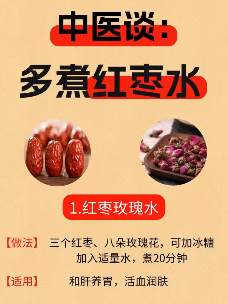 玫瑰疏肝解郁、美容養顏,與紅棗搭配,既能補氣血又能調節情緒。壓力大、愛生氣的女性朋友必喝,喝出好氣色!