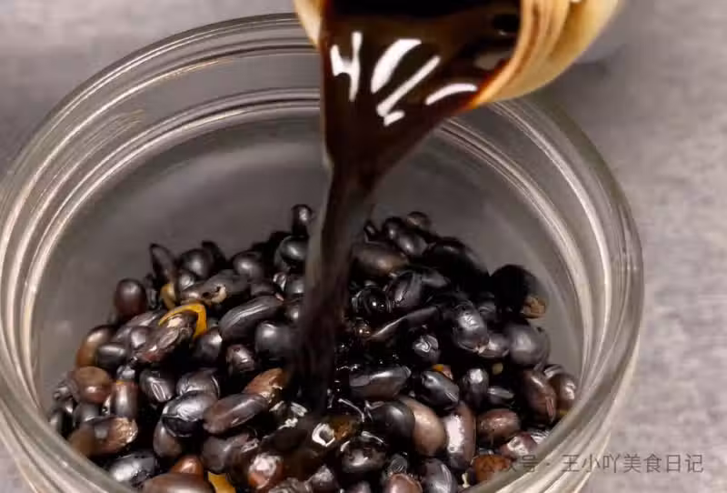 接下來,將老陳醋緩緩倒入裝有黑豆和黃冰糖的容器中,倒至八分滿,確保醋能完全沒過黑豆。倒入醋的過程中,可以輕輕晃動容器,使醋與黑豆充分接觸。醋的用量要根據黑豆的多少和容器的大小適當調整,以剛好沒過黑豆為宜。