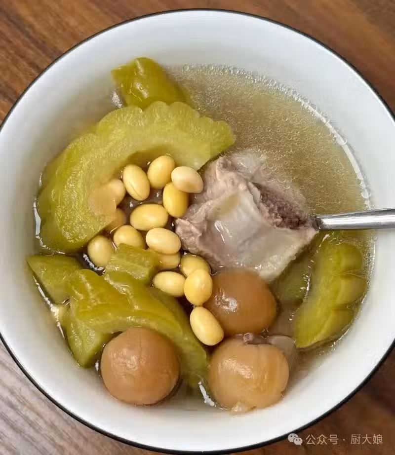 做法: ①黃豆提前浸泡,排骨焯水洗凈備用 ②苦瓜切對半去囊去籽切塊(內囊狠狠刮) ③可用鹽抓拌加水浸泡一會,去除些苦味 ④所有食材放入鍋中,加適量清水燒開轉小火40分鐘 ⑤最後按個人喜好放鹽即可