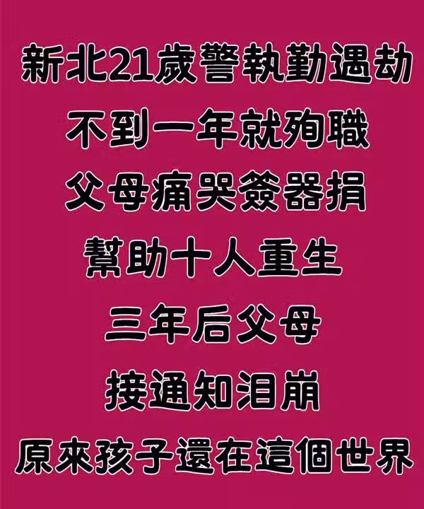 新北21歲警執勤不到一年遇劫殉職 父母痛哭簽器捐「幫助十人重生」三年後父母接通知淚崩:原來孩子還在這個世界