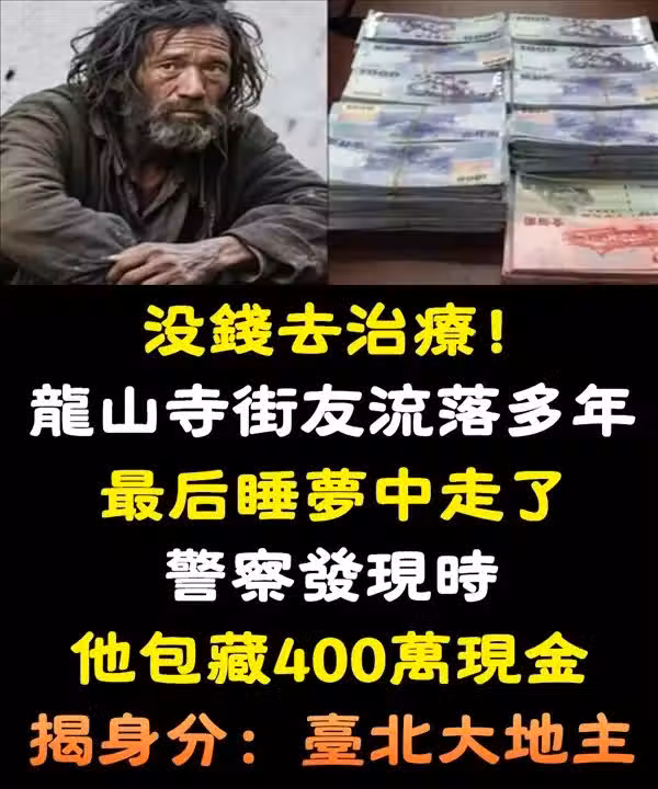 沒錢治療!龍山寺街友流落多年「最後睡夢中走了」 後來警察發現「包包里卻藏著400萬現金」揭身份:台北大地主