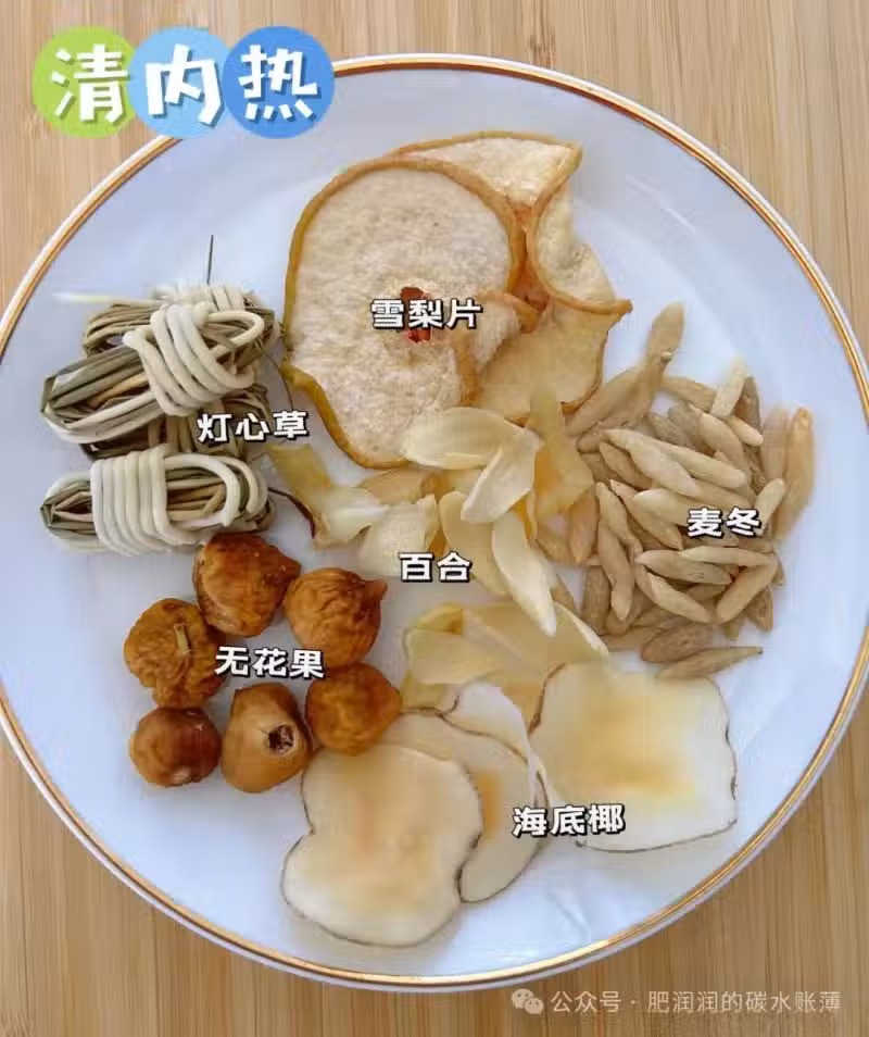 雪梨片2片+燈心草4根+無花果2顆+麥冬5g+百合5g+海底椰2片,煮30分鐘