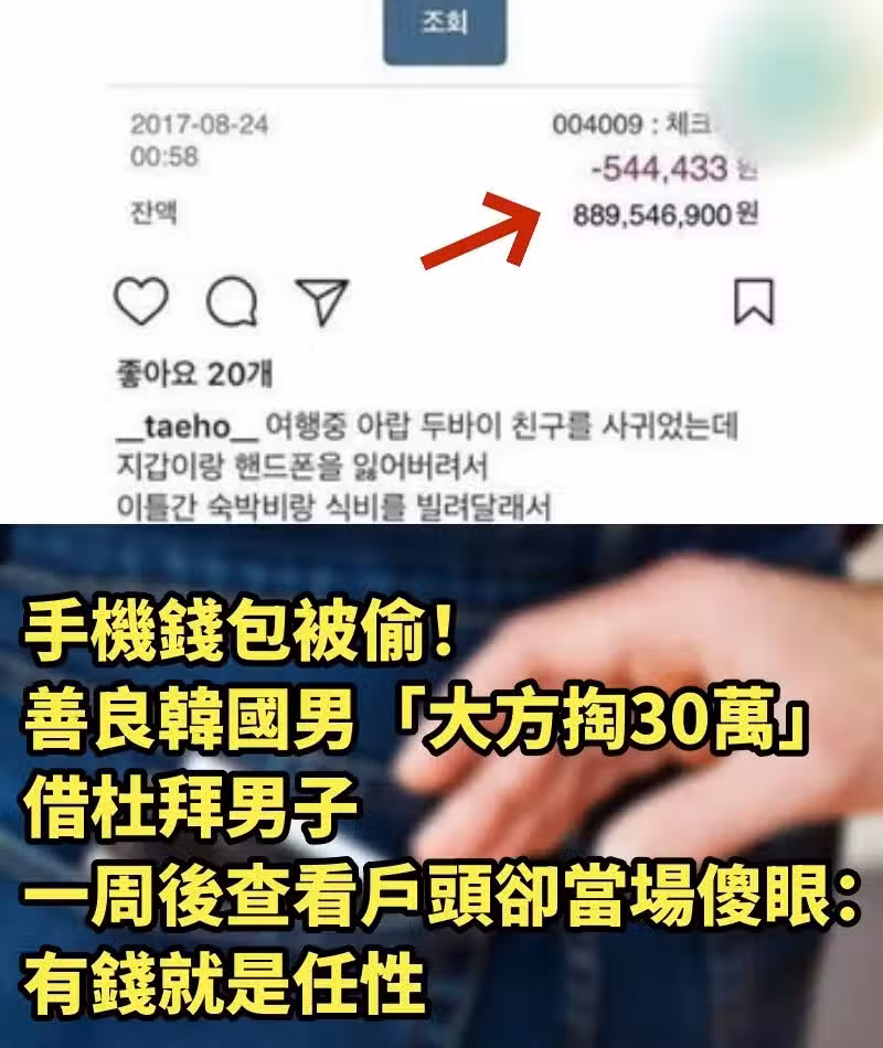 手機錢包被偷!善良韓國男「大方掏30萬...」借杜拜男子 一周後查看戶頭「卻當場傻眼」:有錢就是任性