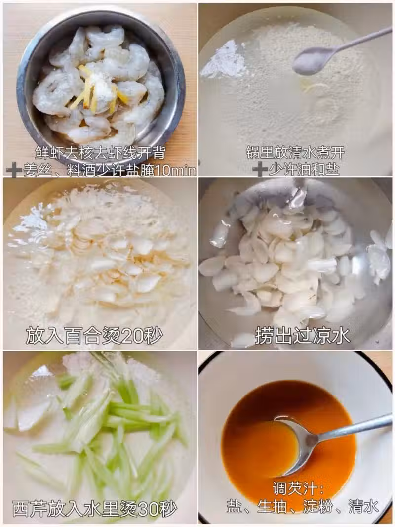 鮮蝦、西芹、百合、勾芡汁(鹽、生抽、澱粉、清水)