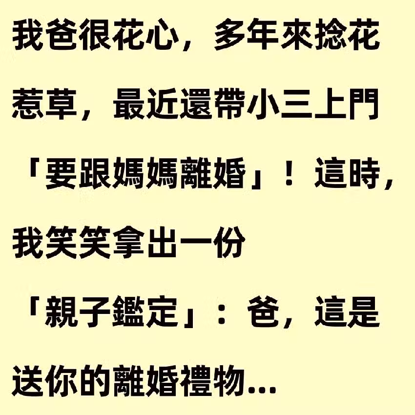 我爸很花心,多年來捻花惹草,最近還帶小三上門「要跟媽媽離婚...」這時,我笑笑「拿出一份親子鑑定」:爸,這是送你的離婚禮物...