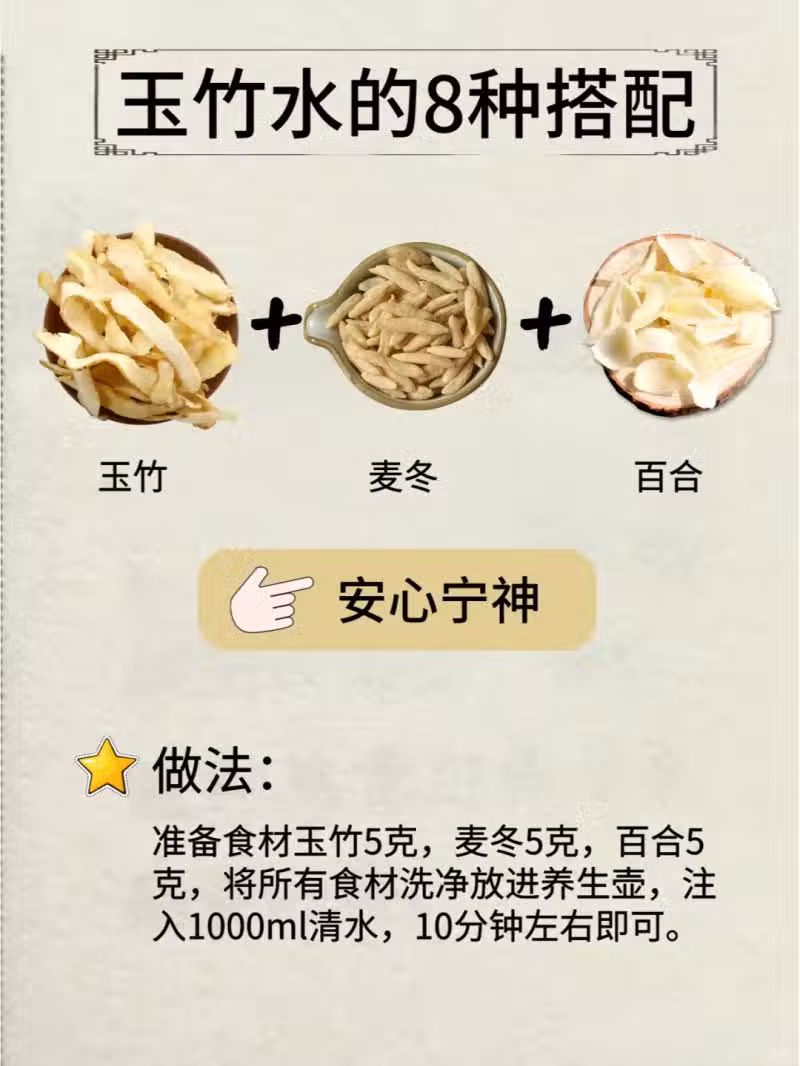 1. 玉竹+麥冬+百合:這組搭配堪稱 「心靈安撫劑」,能安心寧神,幫你趕走焦慮、失眠,每晚都能睡個好覺 。