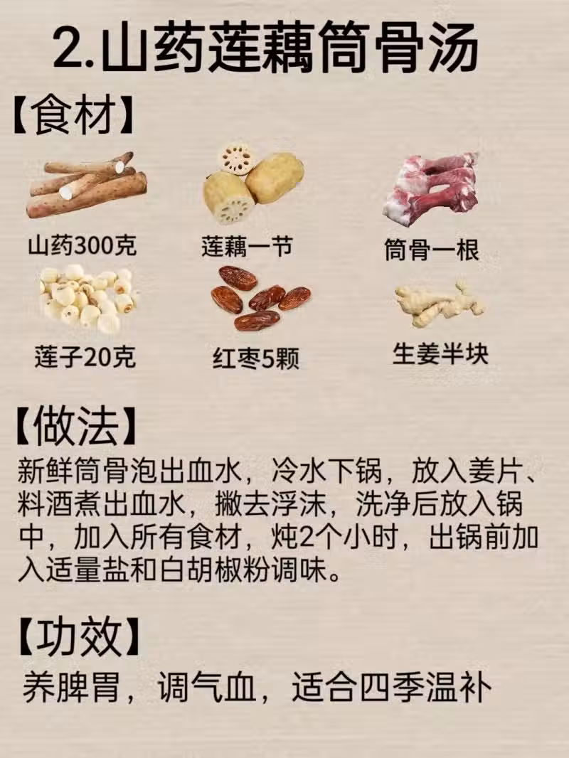 2.山藥蓮藕筒骨湯 養脾胃,調氣血,適合四季溫補。