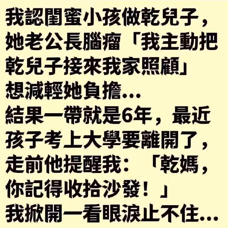 我認閨蜜小孩做乾兒子,她老公長腦瘤「我主動把乾兒子接來我家照顧」想減輕她負擔... 結果一帶就是6年,最近孩子考上大學要離開了,走前他提醒我:「乾媽,你記得收拾沙發...」我掀開一看眼淚止不住