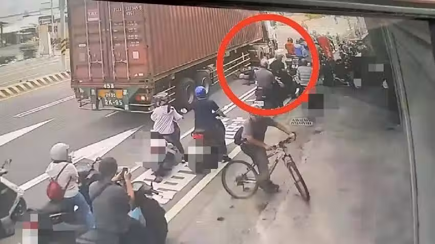 亡命瞬間曝光!連人帶車遭貨櫃車輪輾過 當場爆頭死亡!20多人目睹不敢撇頭