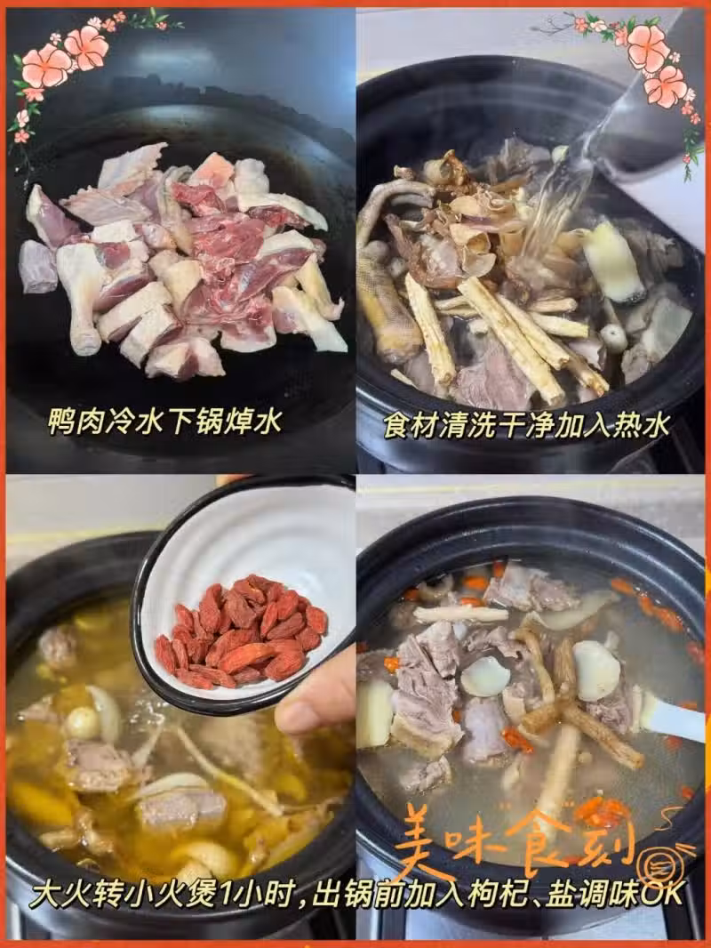 沙參15克 玉竹15克 干百合10克 建蓮子15克 生薑3片 枸杞10克 鴨肉500克