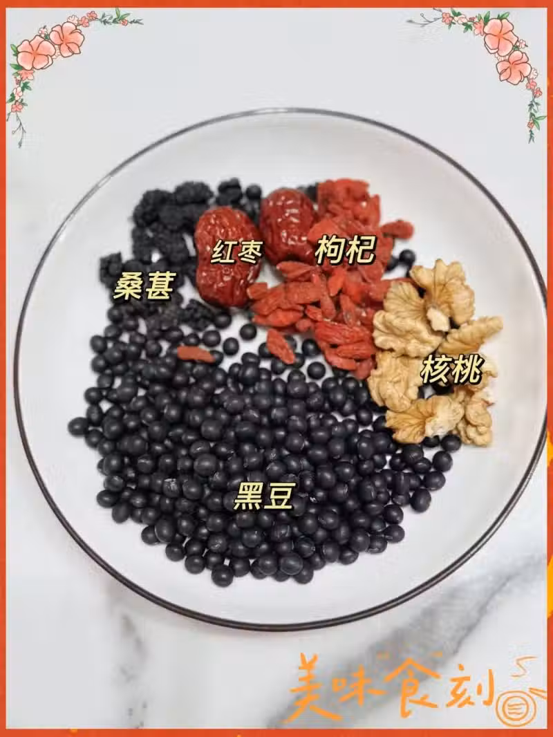黑豆100克、桑葚干10顆、核桃仁20克、