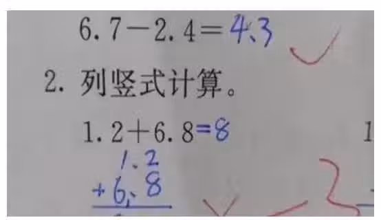 小學生「1.2+6.8=8」被打叉,家長提出質疑