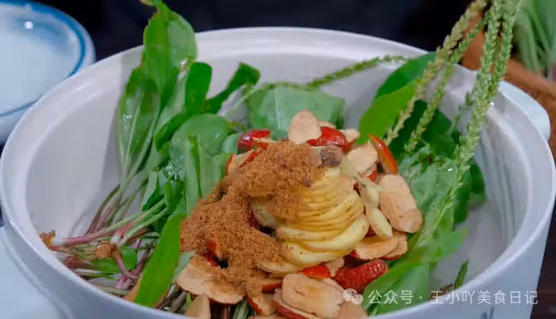 食材入鍋:把處理好的車前草放入燉鍋中,接著將剪好的紅棗塊也放進來,再把切好的薑片一同放入鍋中。