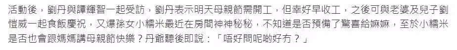 活動結束後,劉丹與主持人譚輝智聯合接受媒體採訪。談及明日母親節行程,他透露因工作安排需正常開工,但會爭取早些收工與家人共進晚餐:「已經跟太太和兒子劉愷威約好了,收工就回家吃飯。」