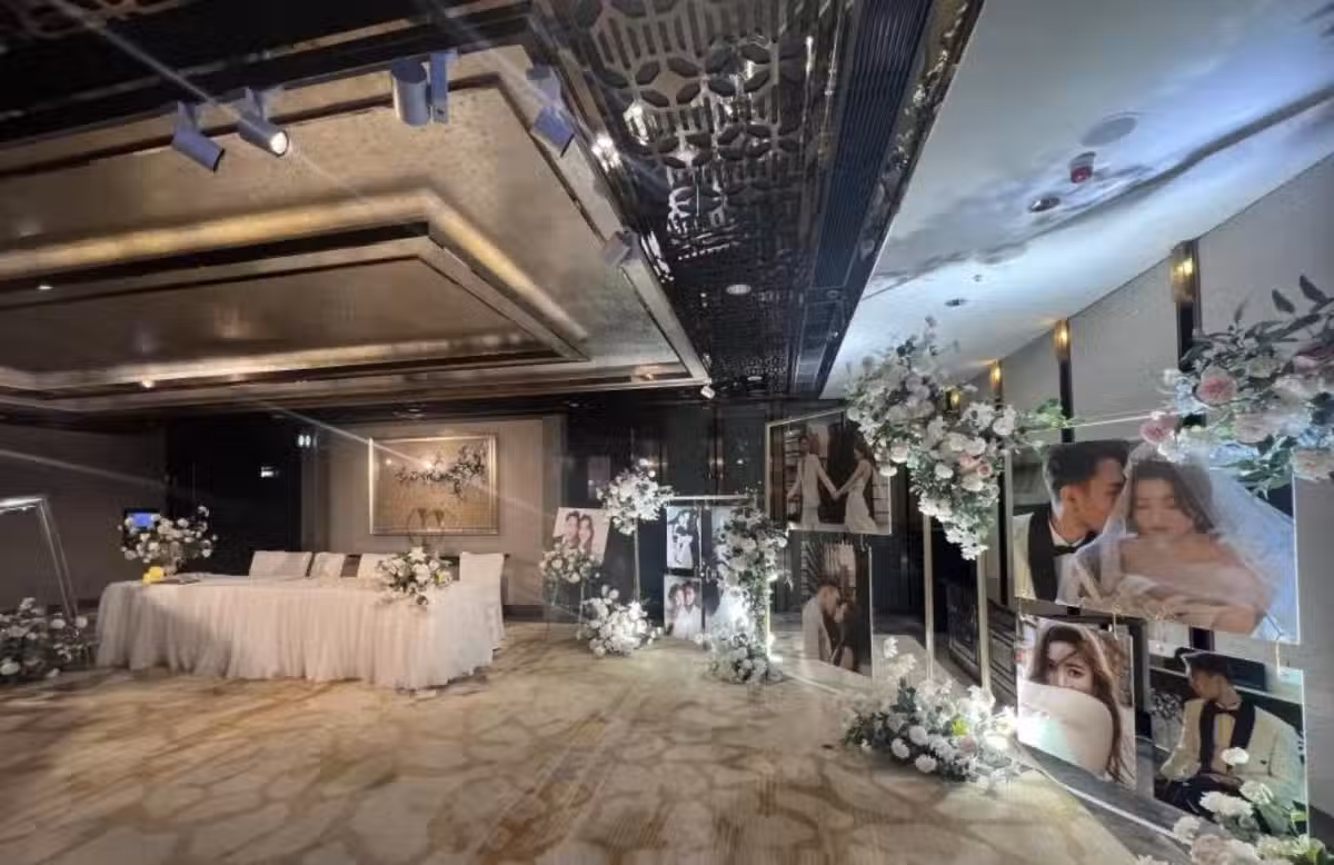 這場婚宴做得還是頗具規模,畢竟請來了那麼多名人、明星,不可能失禮大眾。從現場的布置來看,大氣、體面,在酒店門口處擺放了一張巨型的新人婚紗海報,作為指引,在迎賓廳還有一堆新人的各種婚紗藝術照,再搭配粉色、白色的鮮花裝點,可見現場布置是經過精心設計與包裝的。