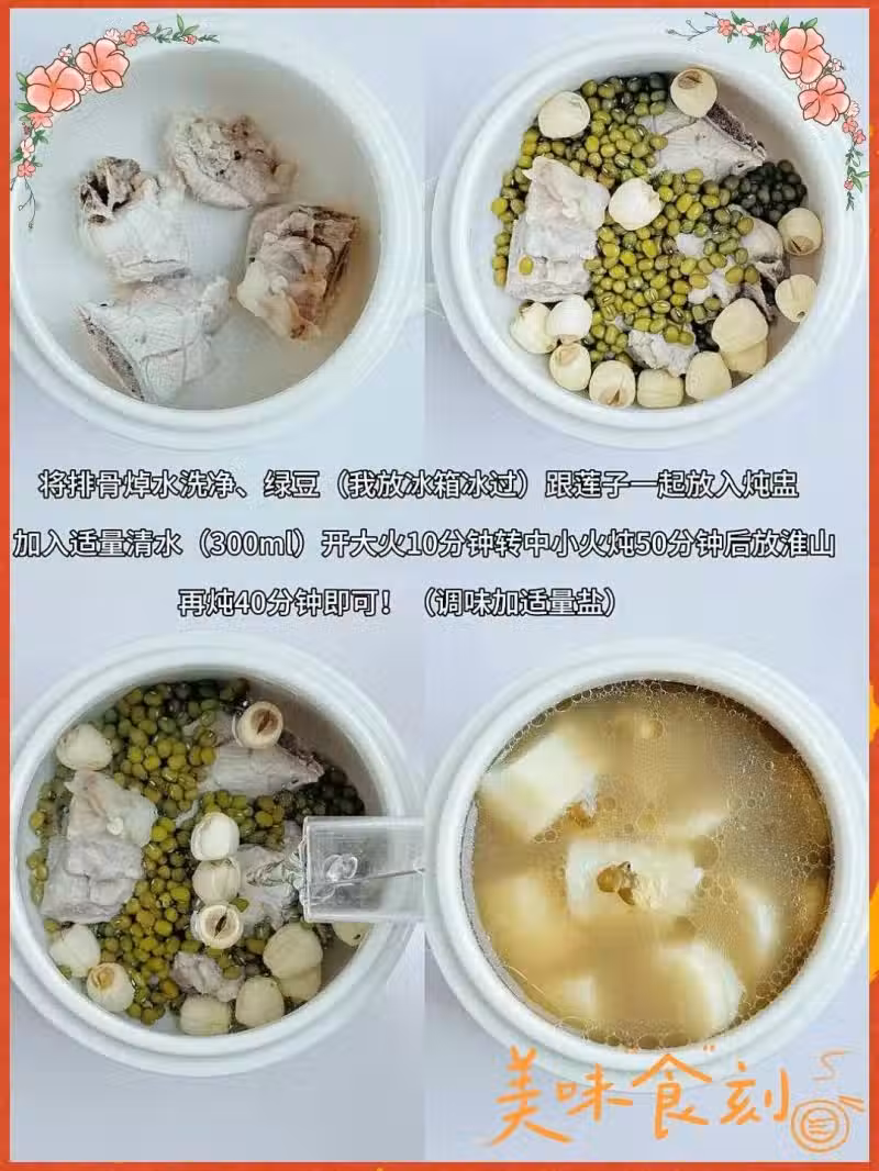 排骨500克、山藥1根(切塊)、綠豆50克、蓮子30克
