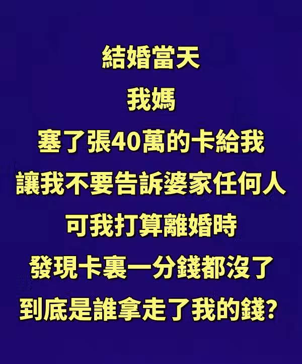 結婚當天我媽塞了張40萬的卡給我,讓我不要告訴婆家任何人,可我打算離婚時,發現卡里一分錢都沒了,到底是誰拿走了我的錢?