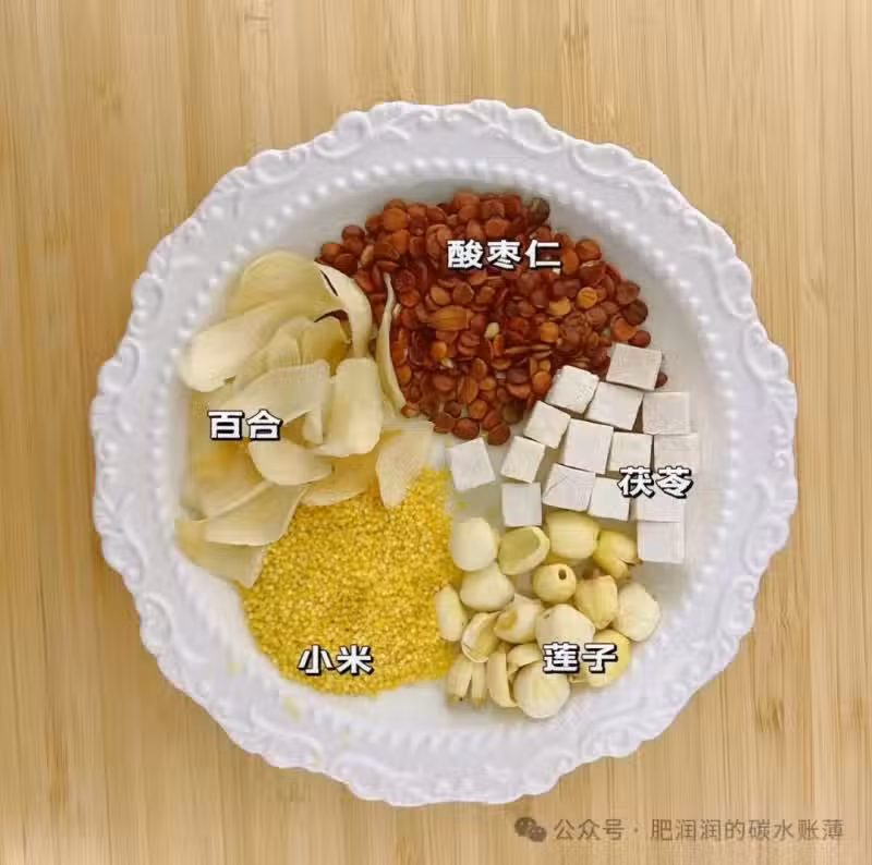材料:小米20g、百合10g、蓮子10g、酸棗仁5g、茯苓5g