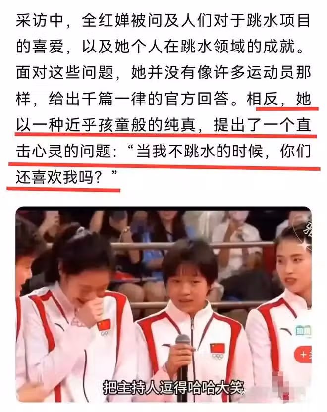 回想去年奧運會後,嬋寶回家度假,和妹妹在一起時,她如同一個小女孩。一般孩子在四五年級時開始發育,但她已經18歲了,發育卻顯得格外緩慢,令人擔心再不發育可能會影響健康。她那頭黃小炸毛,難道一個13歲的孩子竟然營養不良,就讓人心疼了嗎?要知道,黃頭髮並不是染的,而是因為長期訓練、浸泡在水中,也為了減肥控制飲食,營養跟不上導致的。近幾個月,她的身高和體重都迅速增長。可以看出,孩子一直在減肥訓練中控制飲食,而這些天,她的訓練減少,加上可能的自律不足和發育來臨,造成了這次比賽中全紅嬋屈居亞軍的事實。