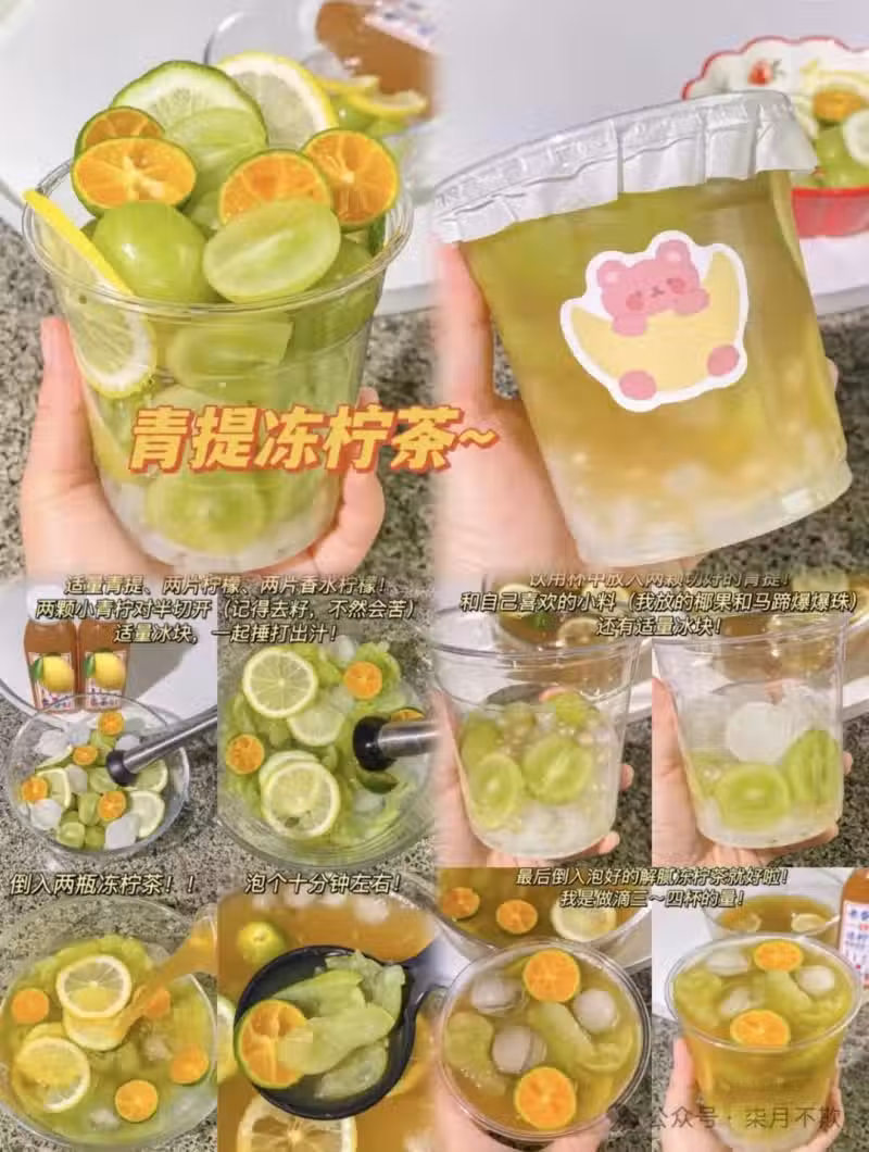 2️⃣寶子們🥰,一口就淪陷的青提凍檸茶來啦! 把新鮮青提、檸檬和香水檸檬與冰塊一起錘打出汁,果香瞬間迸發。再加入椰果、馬蹄爆爆珠等小料,倒入凍檸茶浸泡。清爽酸甜,每一口都能嚼到小料,夏日解暑就靠它啦~ 🍹