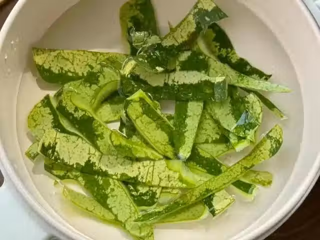 西瓜洗凈,切下綠色外皮後,放入鍋中,加入適量的水小火煮30分鐘左右,釋放其天然精華,最後加入適量冰糖,冷飲更解暑哦!