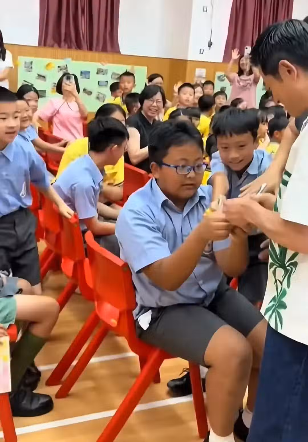 他一進入大堂,兩邊坐著的小學生們立刻驚叫呼呼,雙手鼓掌歡迎他的到來!他也有回應小朋友們的善意,不僅和小學生們握手,還給學生簽名,學生們都非常開心!