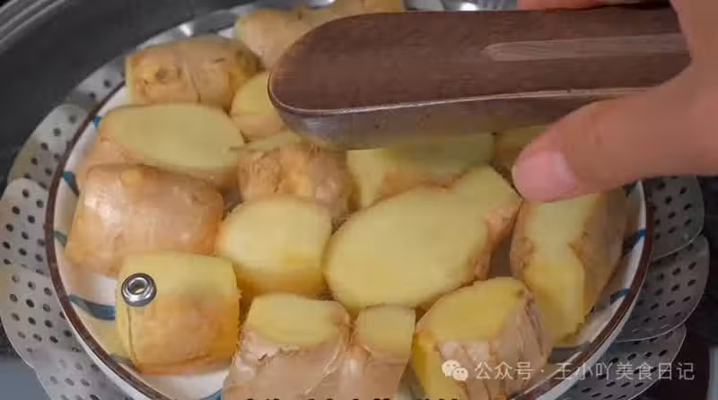 蒸製:大火燒開蒸鍋,上汽後放入蒸盤,保持大火蒸5分鐘。此步驟可軟化姜纖維,去除部分辛辣味,同時保留薑黃酮等有效成分。