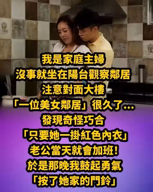 我是家庭主婦,沒事就坐在陽台觀察鄰居,注意對面大樓「一位美女鄰居」很久了...發現奇怪巧合「只要她一掛紅色內衣」老公當天就會加班! 於是那晚我鼓起勇氣「按了她家的門鈴」...