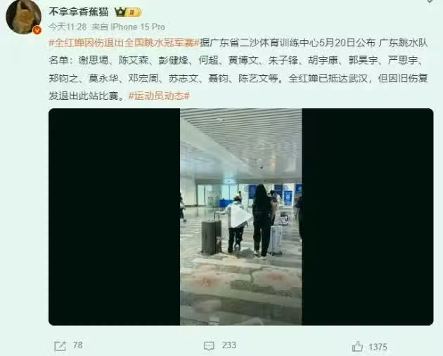 根據廣東隊官方消息,全紅嬋原本已經隨隊抵達武漢備戰,但賽前訓練時,舊傷突然反覆,隊醫評估後認為她不適合參賽。