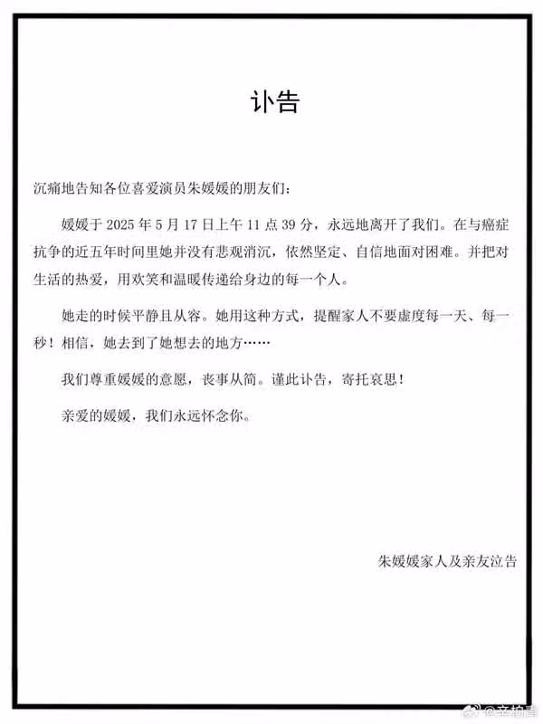 (北京訊)中國女星朱媛媛因罹患癌症於5月17日上午11點39分病逝,享年51歲,同為演員的丈夫辛柏青發表訃告證實噩耗。朱媛媛生前活躍電影、電視劇,曾與李連杰、桂綸鎂合演電影《海洋天堂》。