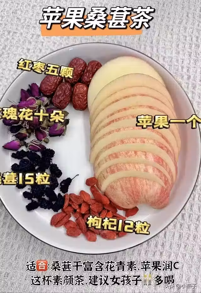 材料:蘋果1個+桑葚干15粒+玫瑰花10朵+紅棗5顆+枸杞12粒。