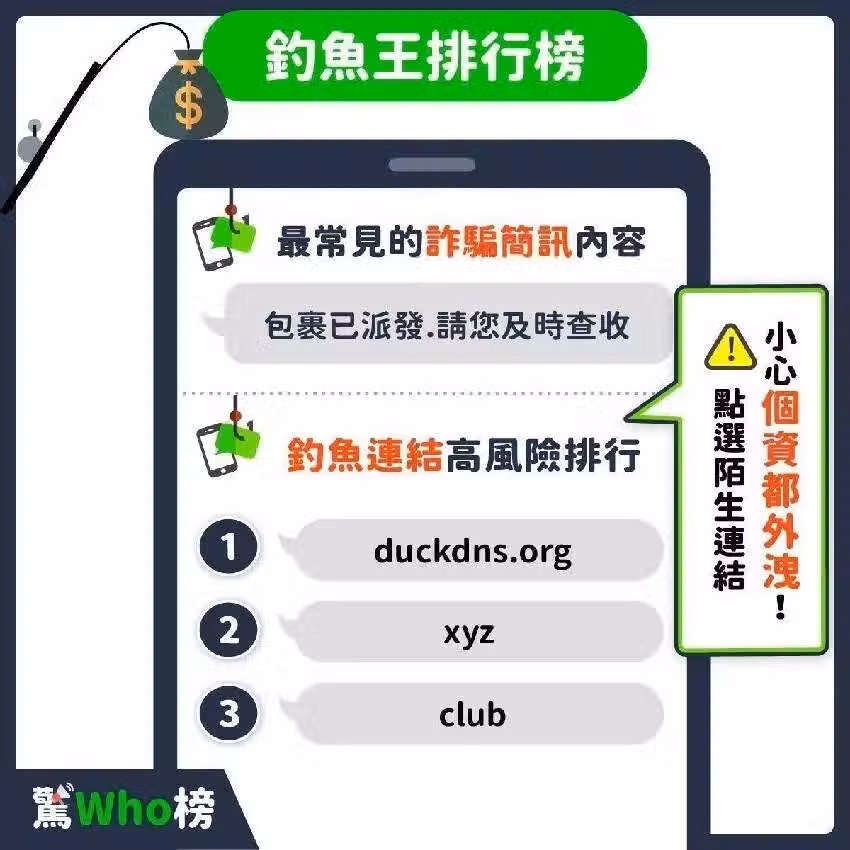 只要你點開,就會導致手機中毒、或是植入木馬程式,造成個資外泄,而這些釣魚網站的前三名,依序為「OOO.duckdns.org」、「OOO.xyz」、「OOO.club」,記得多加註意。