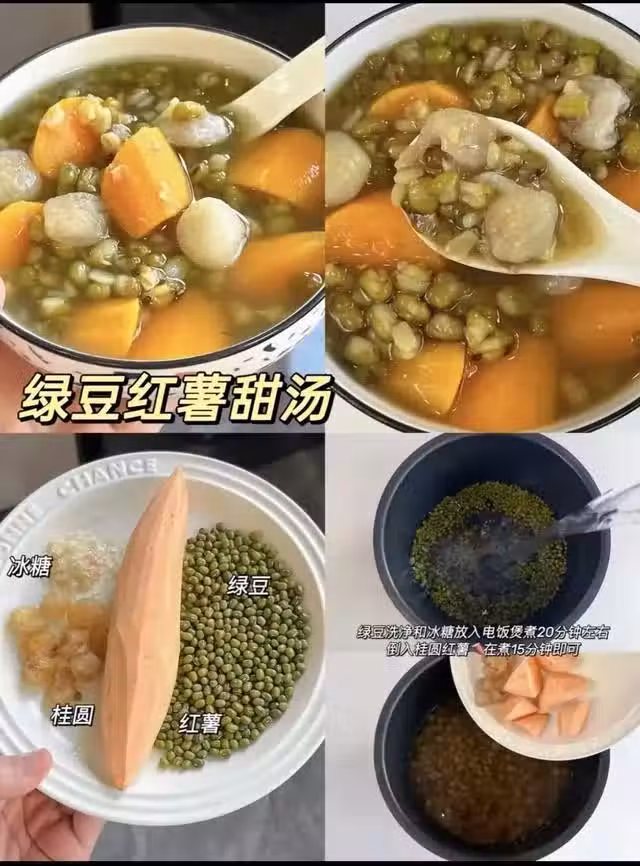 做法:綠豆洗凈和冰糖放入電飯煲煮20分鐘左右,倒入桂圓、紅薯,再煮15分鐘即可。