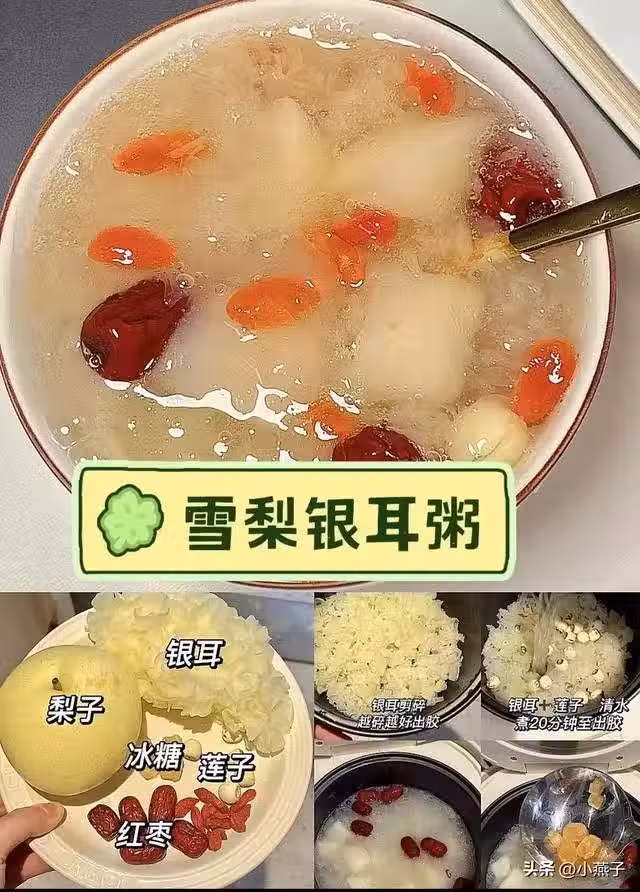 做法:銀耳剪碎+蓮子煮20分鐘出膠→加梨和紅棗煮軟