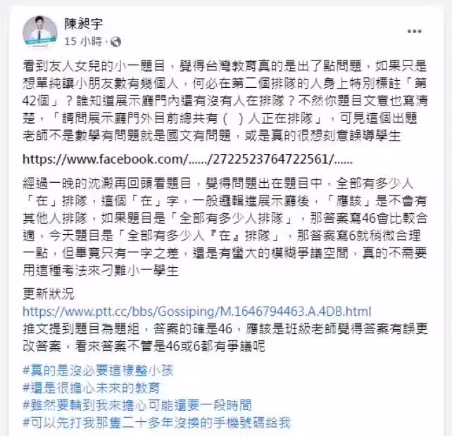 但無論如何,這道考題他覺得反映出台灣教育真的是出了點問題,沒有必要這樣為難小孩。
