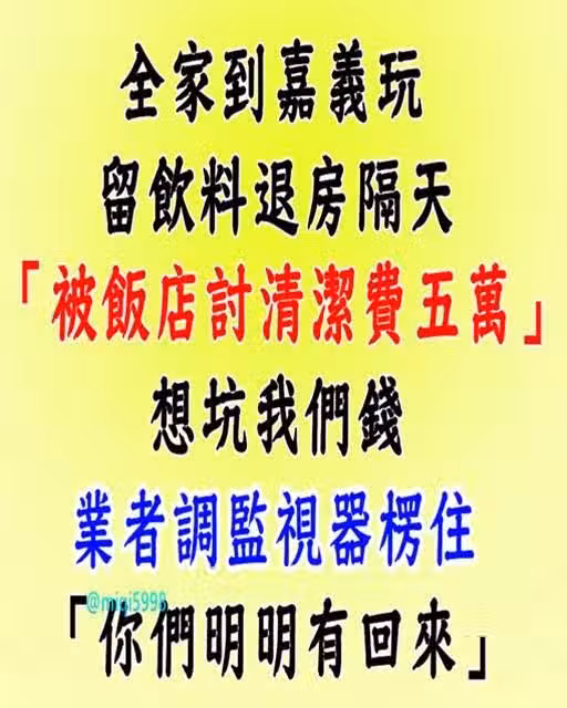 全家到嘉義玩!留飲料退房隔天「被飯店討清潔費5萬」:想坑我們錢 業者調監視器愣住「你們明明有回來」