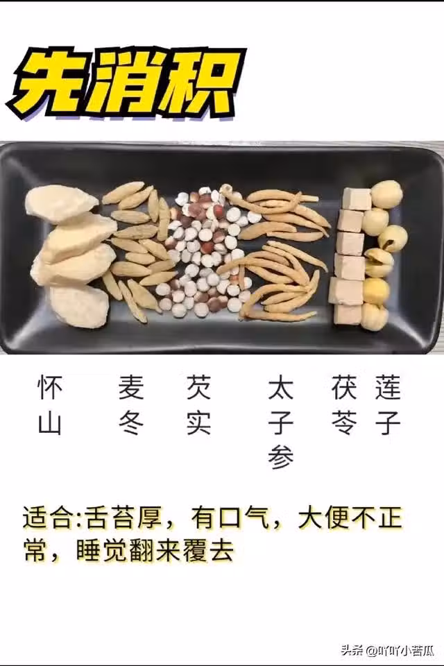 積食茶配方:懷山5g+麥冬5g+芡實5g+蓮子5g+太子參3g+茯苓5g。